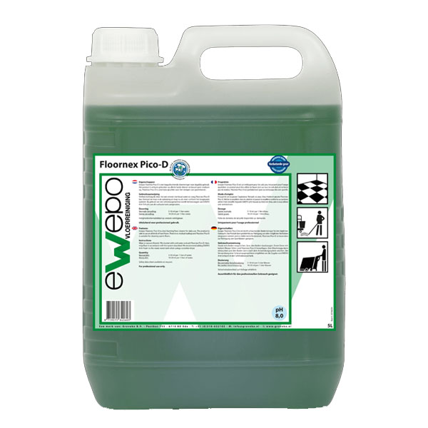 Ewepo Floornex Pico-D Vloerreiniger 6 x 1 liter is een laagschuimende vloerreiniger, speciaal ontwikkeld voor dagelijks gebruik op harde vloeren. Deze krachtige reiniger is veilig te gebruiken op diverse soorten vloeren en bouwt geen residuen op, waardoor de vloer na gebruik geen plakkerig of vettig gevoel achterlaat.