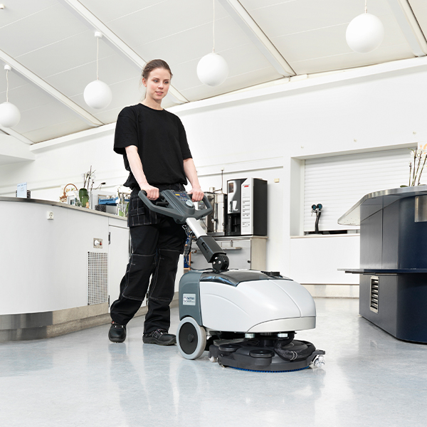 De Nilfisk SC351 schrobzuigmachine maakt het reinigen van krappe ruimten zeer eenvoudig en efficient.
